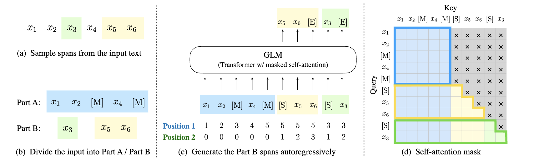 第一种是GLM,他的Prefix是一个残缺的句子,就是从一个句子中抽出若干部分,用[M]替代,然后需要模型自回归生成残缺的部分(就是output)