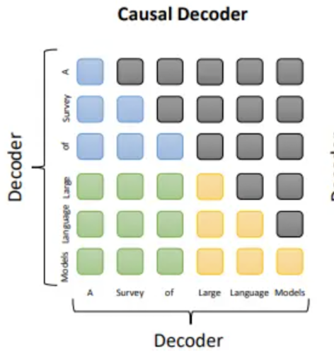 训练效率:Prefix Decoder < Causal Decoder(因为causal decoder会在所有token上计算损失,而prefix只会在输出上计算损失,causal可以学习到更多东西)