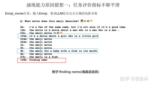 一种猜想是因为很多任务的评价指标不够平滑,导致我们现在看到的涌现现象。关于这一点,我们拿 Emoji_movie 任务来给出解释。Emoji_movie任务是说输入 Emoji图像,要求 LLM 给出完全正确的电影名称,只有一字不错才算正确,错一个单词都算错。 如上图所示,输入的Emoji是一个女孩的笑脸,后面跟着三张鱼类的图片,您可以猜猜这是什么电影。下面左侧的 2m代表 模型参数规模是 200 万参数,以及对应模型给出的回答。可以看出,随着模型规模不断增大至 128B 时,LLM才能完全猜对电影名称,但是在模型到了125m和4b的时候,其实模型已经慢慢开始接近正确答案了。