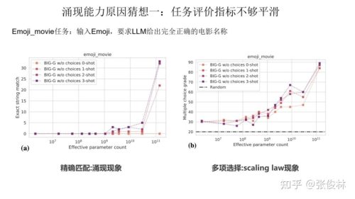 如果评价指标要求很严格,要求一字不错才算对,那么Emoji_movie任务我们就会看到涌现现象的出现,如上图图左所示。但是,如果我们把问题形式换成多选题,就是给出几个候选答案,让LLM选,那么随着模型不断增大,任务效果在持续稳定变好,但涌现现象消失,如上图图右所示。这说明评价指标不够平滑,起码是一部分任务看到涌现现象的原因。