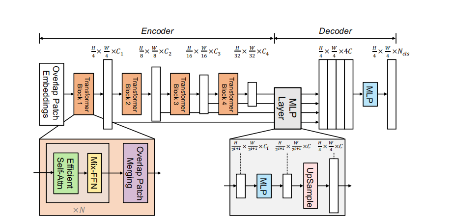 把计算之后的每个多级特征,都经过一个MLP,投影为通道\(C\),然后上采样至尺寸为\(\frac{W}{4}\times\frac{W}{4}\),然后将得到的4个特征Concat,然后投影至通道数为\(C\),在经过MLP,投影到通道数为\(N_{cls}\).