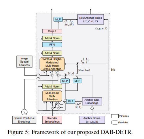 但是DETR里的object query根本就没有先验知识,模型要学出来object query里的位置信息,需要很大的训练量,并且可能收敛不到最优解,因此DAB-DETR显示的将object query用anchor boxes的信息表示。