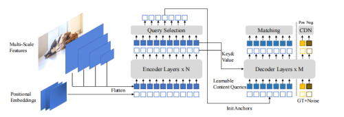 然而,这种方式并没有在后来的工作中得到广泛运用,我们对这种方式进行了一些改进并重新强调其重要性。在query中,我们实际更关心position query,也就是框。同时,从encoder feature中选取的feature作为content query对于检测来说并不是最好的,因为这些feature都是很粗糙的没有经过优化,可能有歧义性。例如对“人”这个类别,选出的feature可能只包含人的一部分或者人周围的物体,并不准确,因为它是grid feature。