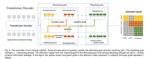 - attention mask:除了加noise之外,在decoder的self attention我们需要加一个额外的attention mask防止信息泄露。因为denoising部分包含真实框和真实标签的信息,直接让matching part看到denoising part会导致信息泄漏。因此,训练的时候matching part不能看到denoising part,像原始模型一样训练。额外增加的denoising part看或者不看到matching part对结果影响不大,因为denosing部分含有最多的真实框和标签。