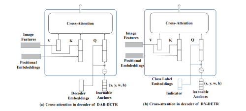 在DAB-DETR的基础上实现DN-DETR,因为DAB-DETR是DN之前最强的模型之一,而且它显示的把decoder query表示为四维坐标很适合添加denoising training。