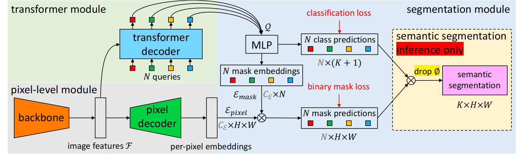 首先,per-segment-embedding经过一个mlp,会输出N个K+1维度的向量,表示各个segment的预测class的类别概率分布,同时,per-segment embedding也会经过一个mlp,这个会输出\({\mathcal{E}_\mathrm{mask}}\in\mathbb{R}^{C_{\mathcal{E}}\times N}\),因为要做分割任务,所以要结合丰富细节信息的pixel-level module输出的per-pixel embedding相乘,\(m_i[h,w]=\operatorname{sigmoid}(\mathcal{E}_\mathrm{mask}{[:,i]^\mathrm{T}}\cdot\mathcal{E}_\mathrm{pixel}{[:,h,w]}).\),产生N个mask。这样一来,mask的产生和分类是分开进行的,区别于传统的per pixel model