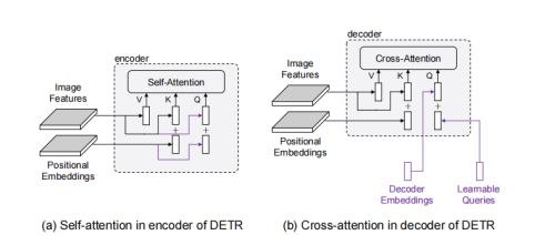 但是实际上是由两组向量组成,我们称之为content query和positional query(这两个名字由conditional detr提出。)这里画出来了encoder和decoder中的attention的组成部分。